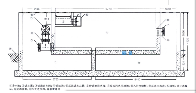 水質(zhì)凈化池池體結(jié)構(gòu)包括進水渠、4座凈化砂濾池、濾后凈水池、反洗污水池,池體凈尺寸20840mn1×14690mmx4420mm(長×寬*高),容積135 3m'3,池壁厚度300mm-500mn,。4座砂濾池交替進行過濾、反洗和化學清洗。回川水凈化處理后.m水進入凈水池,反洗水進入反洗污水池。水質(zhì)凈化池池體結(jié)構(gòu)的設計斷面如圖l所示。
