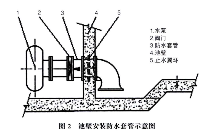 為確保管道與池壁接觸處防水效果以及避免水泵等設備運行時產(chǎn)生振動使接觸處松動,安裝帶有止水翼環(huán)(如圖1中⑩所示)的防水套管(如圖1中⑥所示)。防水套管的安裝與模板、鋼筋的施工同步進行,密切配合,做到高程、位置完全準確,安裝牢固。套管穿越處池壁中的鋼筋彎曲或截斷時,鋼筋與套管焊接相連,套管四周按設計要求安裝加同筋。防水套管施工如圖2所示。