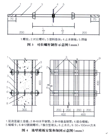 安裝池壁模板至設汁標高,用對拉螺桿加固;按照設計要求進行整體找平、校正后擰緊所有螺桿的螺帽;模板所有接縫緊密不漏漿、小錯位。模板支撐系統(tǒng)采用Φ48x3.5鋼管,用對拉圓螺桿和蝴蝶卡固定,模板按400mm×400nlm分布對拉圓鋼螺桿。拆模后拆下螺桿兩頭錐臺型堵頭,將螺桿沿堵頭預留的凹坑底割除,再用防水水泥砂漿抹平模板安裝和加固如圖4所示。